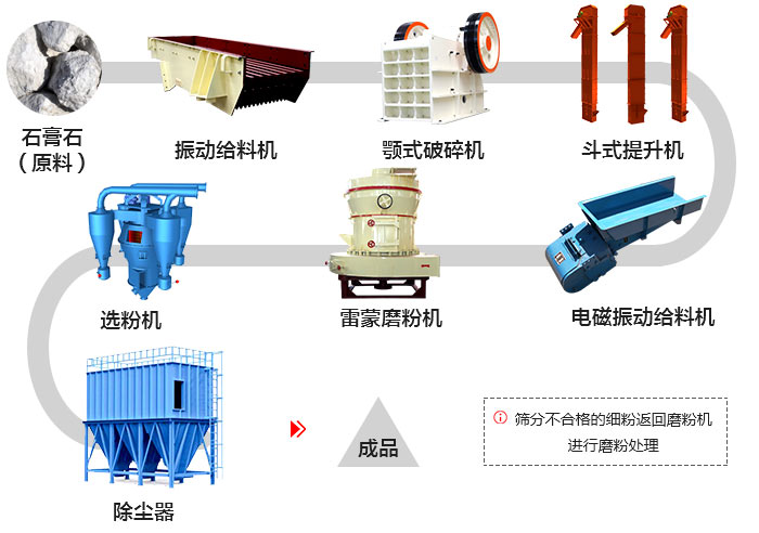 大塊的石膏石原料在給料機的作用下,并均勻、連續(xù)的送入顎式破碎機進行粗碎加工,破碎后的石膏石在斗式提升機的作用下被送入料倉,之后由電磁振動給料機均勻、定量的送到雷蒙磨粉機進行磨粉加工,經(jīng)磨粉后的粉末在鼓風機的租用下吹向分析機進行分選,分選后的物料由廣島輸送到大旋風收粉器,后經(jīng)出料口輸出。